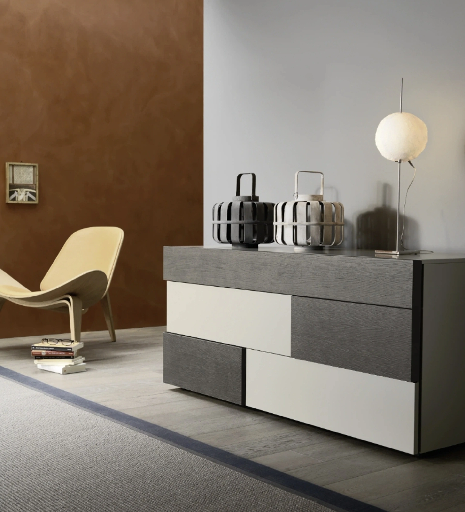 Clicca e scopri di più sul comodino Insieme Comò: Comodini e cassettiere di Sangiacomo sono ideali per spazi moderni.